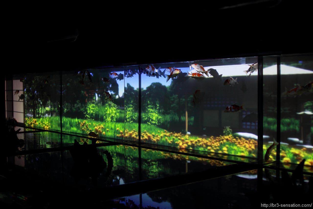 全長8mの巨大水槽に舞う錦鯉。バックは日本の四季をプロジェクションマッピングして投影するしかけ。それだけではなくて、観客席の手前にも4つほどの浅い水槽が並べられており、映像が写り込んで映えます。池には流木もあしらわれており、陰影が見事です。